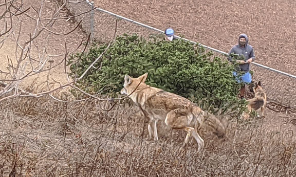 Here’s a coyote on Corona Heights in 2020 with a woman walking her dog just beneath at the right.