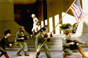 The group had at least two dozen participants and didn’t hold together too well. After a hiatus during the last half of 1979 I returned to a meeting in early 1980 at which everyone was very despondent. I proposed that we don surplus military fatigues and declare martial law, since the whole “America Held Hostage” Iranian crisis seemed to lead in that direction. Take the implied trajectory and push it further, a technique that took the absurdity of what we faced and push it to its logical insane conclusion. This was enthusiastically embraced and for the next six months or so, the Union of Concerned Commies became an odd type of street theater group, appearing downtown, on Sproul Plaza at Berkeley, at political rallies in the Civic Center, and so on. Before long we were friends with the Reagan for Shah Committee and its auxiliary Ladies Against Women, as many people began to take up the ironic approach to political dissent in that moment (not that it was particularly new).