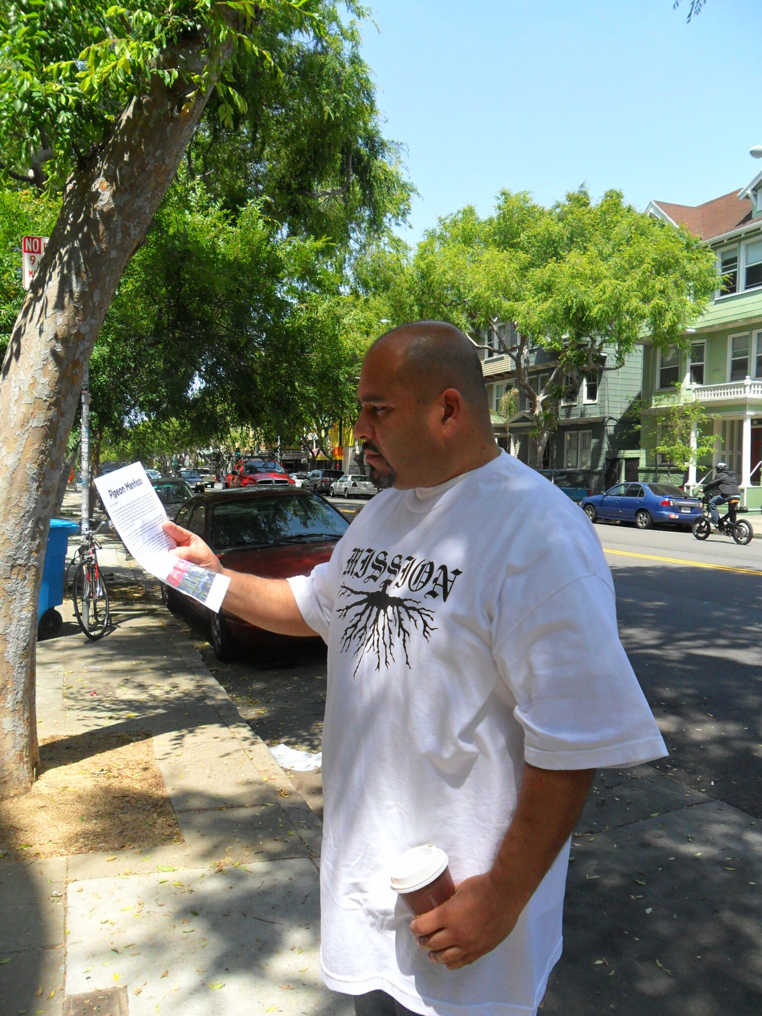 Oscar Salinas was one of the first to arrive. He stood on the sidewalk reading a flyer; this was the Pigeon Manifesto, written by the tenants. It began: “Our six-unit building is called the Pigeon Palace, after the hearty rule-defying birds loved by our dear landlord Frances Carati. But oh shit! Our home is for sale! And the vultures are circling.”