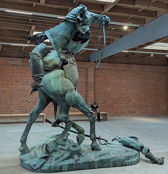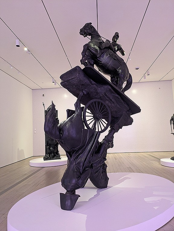 Kara Walker, an extraordinary artist who has had an amazing show (Fortuna and the Immortality Garden—Machine) running in the free part of the SF MOMA for the past year (where the Rivera Mural sat in the separate gallery along Howard Street), was offered the dismantled giant monument of confederate general Stonewall Jackson to render into something else. And did she ever! Her Unmanned Drone (2022) is a wild, twisted dismembering and re-membering of the man, his horse, and the various limbs and weapons that had been erected to extend his life and that of “The Lost Cause” into an indefinite future, but are now a defigurative apparition condemned to stumble and lurch defeated and unrecognizable through a permanent purgatory of civil war remembrance. But also to announce loudly the revolt that toppled the original, the context of its re-de-configuration, and in this case, to anchor the “MONUMENTS” show at MOCA in Los Angeles.