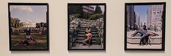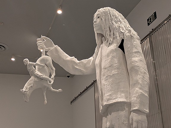 Walker’s stunning work stands alone at The Brick, and the rest of the show is next to Japantown. There you come face to face with a dozen massive confederate monuments removed from Richmond, Virginia and New Orleans, homeless artifacts after their demolition in the wake of three events described by Carolina A. Miranda in her review in the New York Review of Books (March 12, 2026): “the mass murder of nine Black parishioners by a white supremacist at the Mother Emanuel Church in Charlestown, South Carolina, in 2015; the violent Unite the Right rally two years later, when white nationalists descended on Charlottesville (Virginia) to preserve a monument to [Robert E.] Lee that was slated for removal, resulting in the death of a counterprotester; and the killing of [George] Floyd by a Minneapolis police officer, which sparked protests globally.” At the Geffen the large, often vandalized statues are juxtaposed to contemporary responses by a variety of artists, ranging from a bronzed rendition of Ferguson, Missouri (site of Michael Brown’s murder by police and subsequent uprising in 2014) to a series of portraits, “Stranger Fruit” by NY photographer Jon Henry, of black women with their adult black sons in their arms in the form of the classic Pietá facing across the room a massive Daughters of the Confederacy rendition of their version of it. In the show are graffitied pedestals, the disembodied arm and upright finger taken from the Jefferson Davis monument (the Vindicatrix, aka “Miss Confederacy”) which is tucked in an out-of-the-way corner with a video camera filming it, so it appears as distorted projections in various spots around the exhibit hall, to jarring photos of KKK members in full garb to several moving videos filling up whole rooms, including a subversive remix of Birth of a Nation. Somber bronze statues of Josephus Daniels (a newspaper publisher who fomented the white supremacist massacre and coup against the elected black city government in Wilmington, North Carolina in 1898), and Roger B. Taney, the Supreme Court chief justice who penned the Dred Scott decision, sit impassively along a wall across from dozens of portraits of working class southerners both black and white at the turn of the 20th century.
