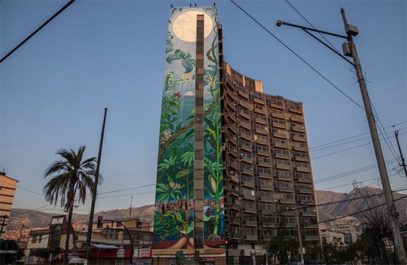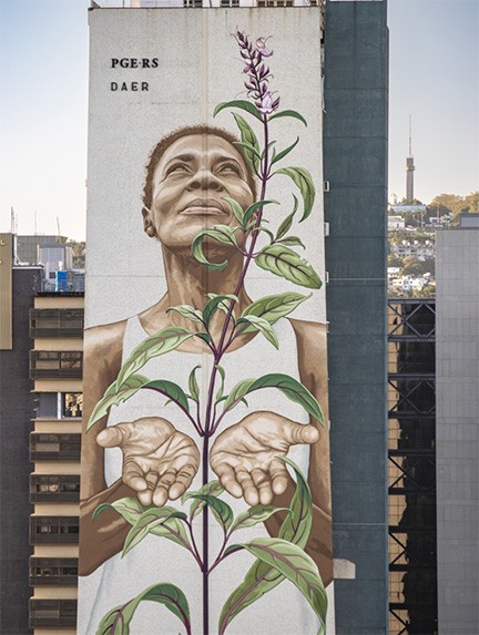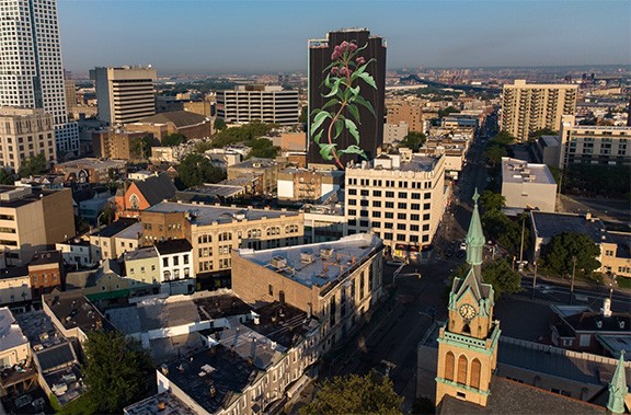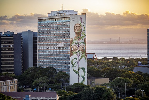 Outside of these examples, my old friend and collaborator Mona Caron has been carrying out a years-long public mural practice that memorializes on a monumental scale overlooked protagonists of history. From water defenders towering over a streetscape in Quito, Ecuador, to a Brazilian herbalist and healer soaring a dozen stories over a major public plaza in Porto Alegre, Brazil, her work directly rebukes the white supremacist monumentality that has dominated public spaces in the global north. But beyond selecting indigenous women for her giant murals, she has also pushed obscure weeds into the foreground, filling multi-storied building walls in New Jersey, the Bay Area, and many other places in North America and Europe with local disregarded plants that survive in the cracks of a concrete-dominated modern world.