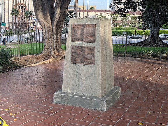 Empty plinth that once held the Serra statue near Olvera Street in LA.
