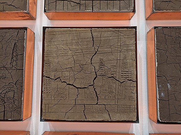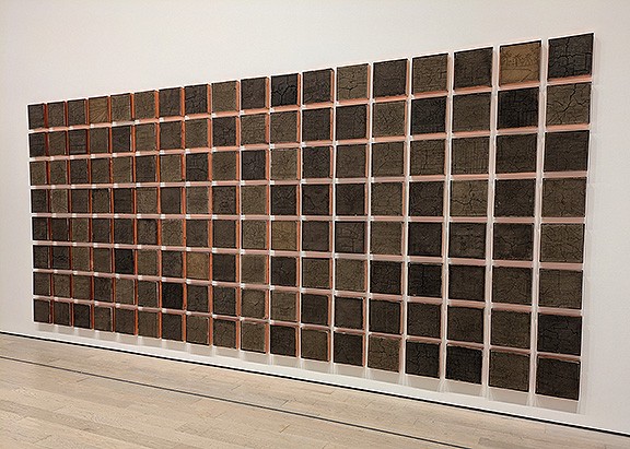 Another artist at LACMA, Jackie Amézquita, interweaves collected soil samples with historic maps to turn a wall into a grid of dried mud squares that reveal a great deal about the built landscape covering the “soil that feeds us” as she titles her remarkable piece.